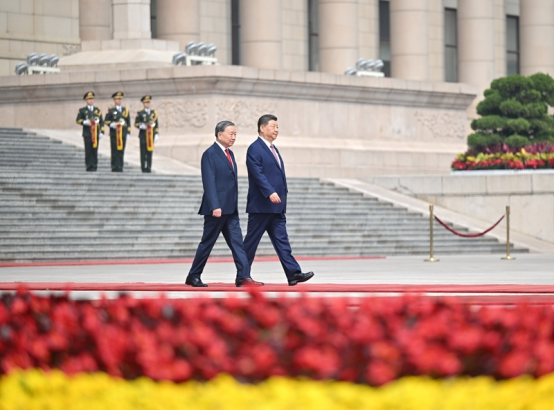 4月15日上午,中共中央总书记、国家主席习近平在北京人民大会堂同来华进行国事访问的越共中央总书记、国家主席苏林举行会谈。这是会谈前,习近平在人民大会堂东门外广场为苏林举行欢迎仪式。新华社记者 李响 摄