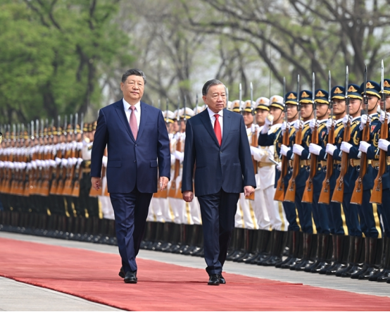 4月15日上午,中共中央总书记、国家主席习近平在北京人民大会堂同来华进行国事访问的越共中央总书记、国家主席苏林举行会谈。这是会谈前,习近平在人民大会堂东门外广场为苏林举行欢迎仪式。新华社记者 燕雁 摄