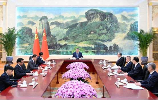 4月21日下午,中共中央总书记、国家主席习近平在北京人民大会堂会见作为老挝人民革命党中央总书记、国家主席通伦特使专程来访的老挝人革党中央政治局委员、常务副总理沙伦赛。新华社记者 黄敬文 摄